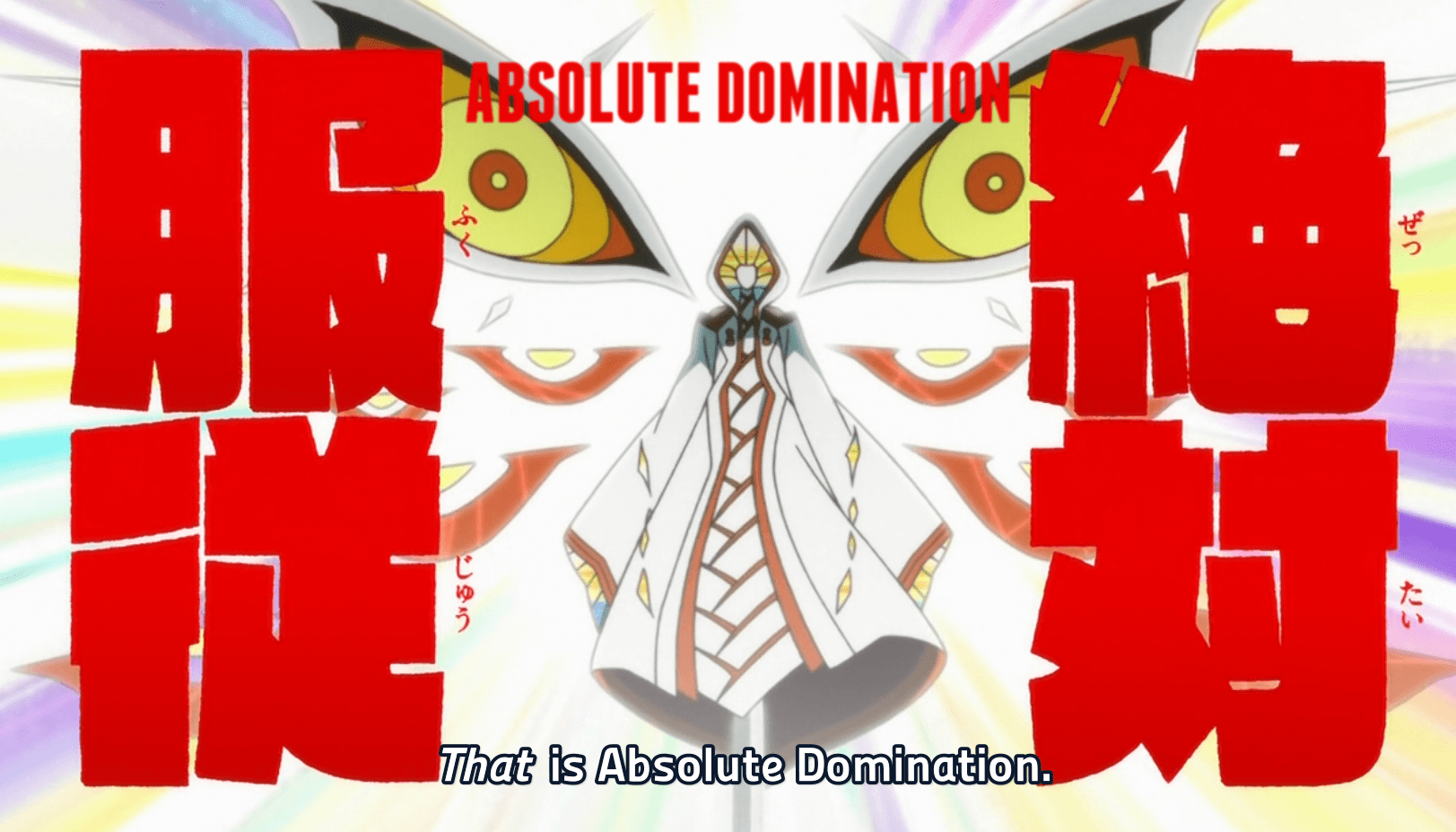 As Ragyo goes into the tradition bad guy laugh, she is pierced by Senketsu. When Ragyo asks how its possible, Senketsu response that its “neither human or clothing”. Senketsu then uses “blade gale”, to fly through Ragyo removing Rei in the process. This ends the effects of Absolute Domination, allowing everyone to use their power.