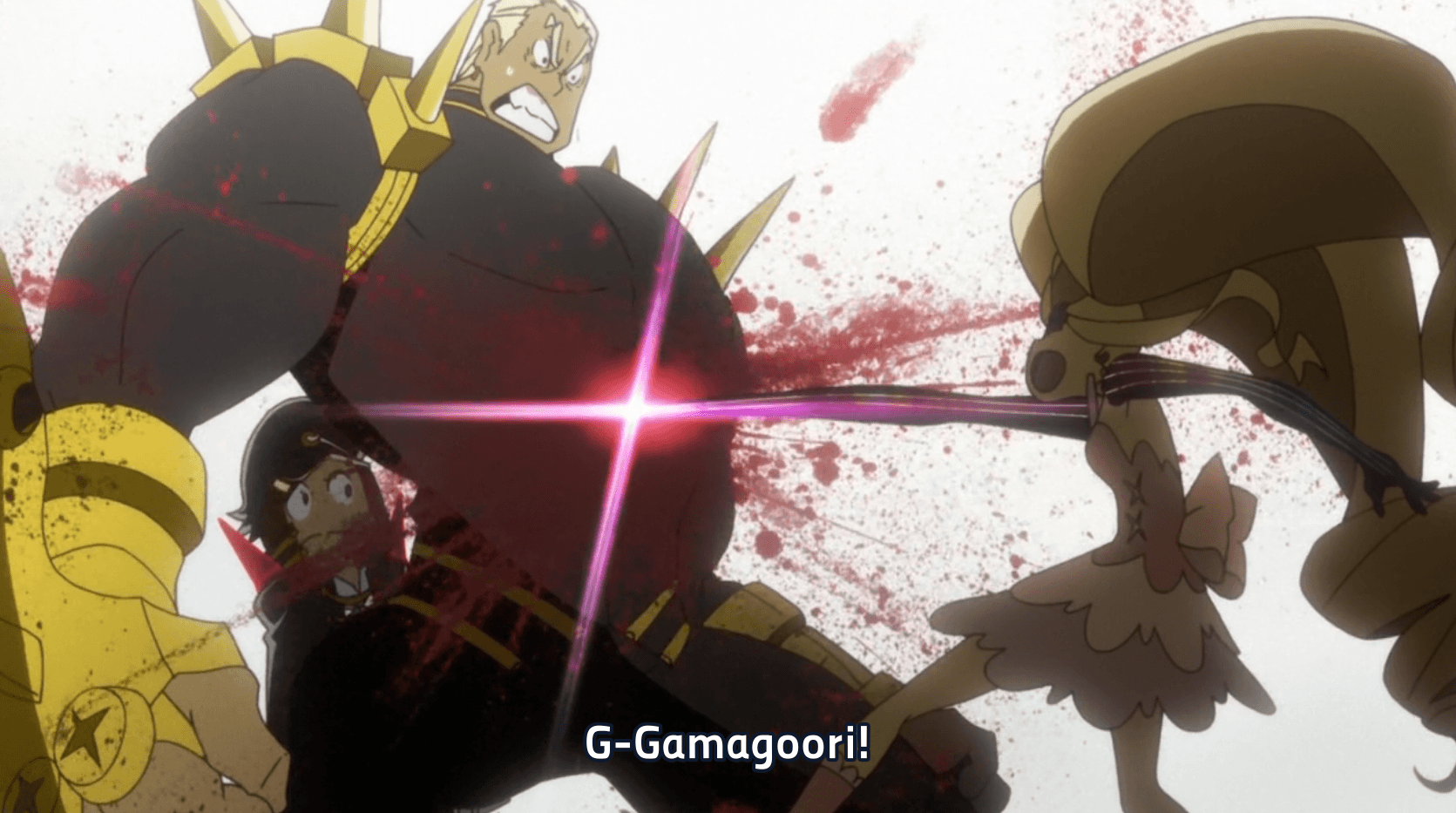 Aikuro and Tsumugu arrive and merge DTR to form “Ultimate Double Naked DTR”. They are quickly dispatched by Ragyo, she activates the still living original life fiber so that it can consume the rest of the humans. The Four Devas along with Mako arrive, and Mako begins her usually spotlight speech.